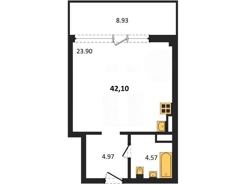 В продаже имеются студио-апартаменты с отделкой в жилом комплексе "Garden" премиум-класса. Общая площадь составляет 42,1 кв.м., при этом жилая зона с кухней занимает 23,9 кв.м. Все окна выходят на одну сторону. В квартире есть лоджия и санузел. Высота потолков достигает 2.7 м.
