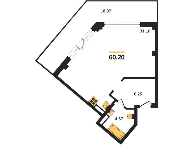 В продаже имеются студио-апартаменты с отделкой в жилом комплексе "Garden" премиум-класса. Общая площадь составляет 60,2 кв.м., при этом жилая зона с кухней занимает 31,1 кв.м. Все окна выходят на одну сторону. В квартире есть лоджия и санузел. Высота потолков достигает 2.7 м.