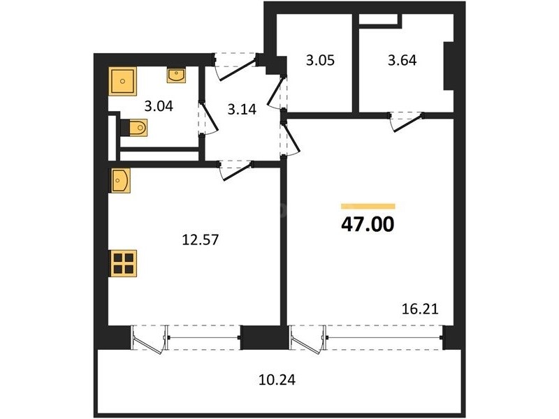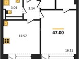 В продаже имеются квартиры в жилом комплексе "Аквамарин Park" премиум-класса. Общая площадь составляет 47 кв.м., при этом кухня - 12,57 кв.м. Высота потолков достигает 3 м.