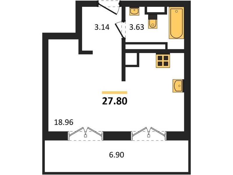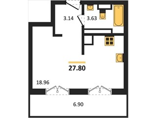 В продаже имеются квартиры в жилом комплексе "Олимпия 2.0" премиум-класса. Общая площадь составляет 27,8 кв.м., при этом жилая зона с кухней занимает 18,96 кв.м. Все окна выходят на одну сторону. В квартире есть лоджия и санузел. Высота потолков достигает 2.7 м.