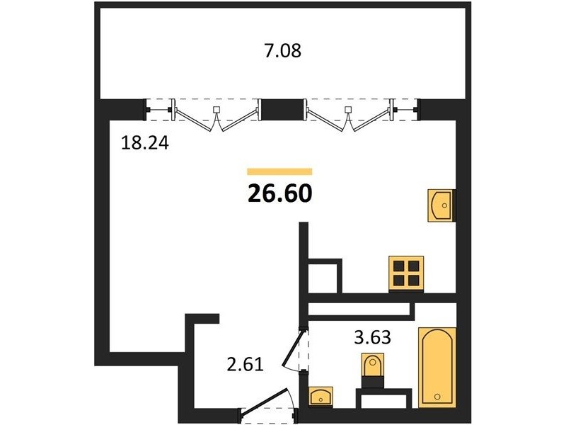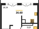 В продаже имеются квартиры в жилом комплексе "Олимпия 2.0" премиум-класса. Общая площадь составляет 26,6 кв.м., при этом жилая зона с кухней занимает 18,24 кв.м. Все окна выходят на одну сторону. В квартире есть лоджия и санузел. Высота потолков достигает 2.7 м.