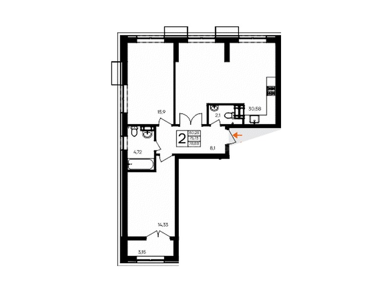 В продаже имеются квартиры в жилом комплексе "Семисчастье" премиум-класса. Общая площадь составляет 78,881 кв.м., при этом кухня - 30,58 кв.м. Высота потолков достигает 2,7 м.