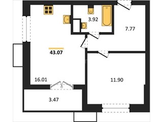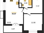 В продаже имеются квартиры в жилом комплексе "Семисчастье" премиум-класса. Общая площадь составляет 43,074 кв.м., при этом кухня - 16,01 кв.м. Высота потолков достигает 2,7 м.