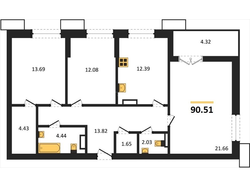 В продаже имеются квартиры в жилом комплексе "Семисчастье" премиум-класса. Общая площадь составляет 90,51 кв.м., при этом кухня - 12,39 кв.м. Высота потолков достигает 2,7 м.