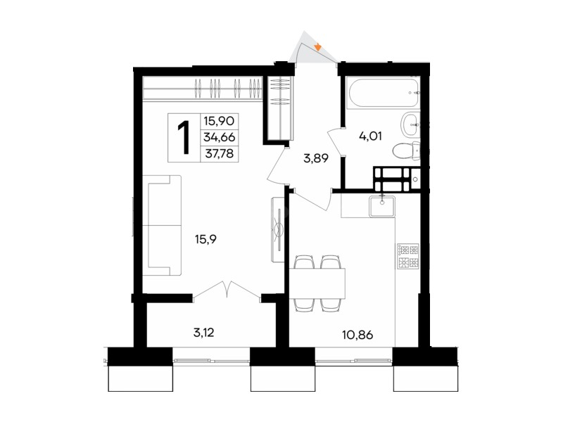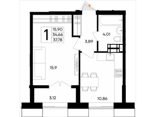 В продаже имеются квартиры в жилом комплексе "Семисчастье" премиум-класса. Общая площадь составляет 37,783 кв.м., при этом кухня - 10,86 кв.м. Высота потолков достигает 2,7 м.