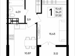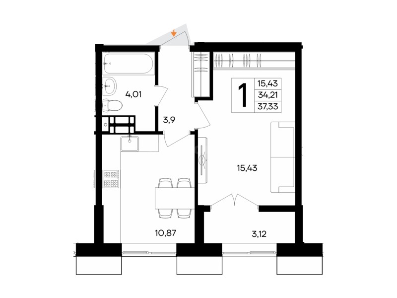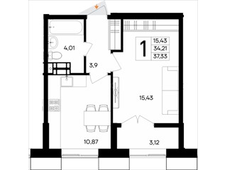 В продаже имеются квартиры в жилом комплексе "Семисчастье" премиум-класса. Общая площадь составляет 37,331 кв.м., при этом кухня - 10,87 кв.м. Высота потолков достигает 2,7 м.