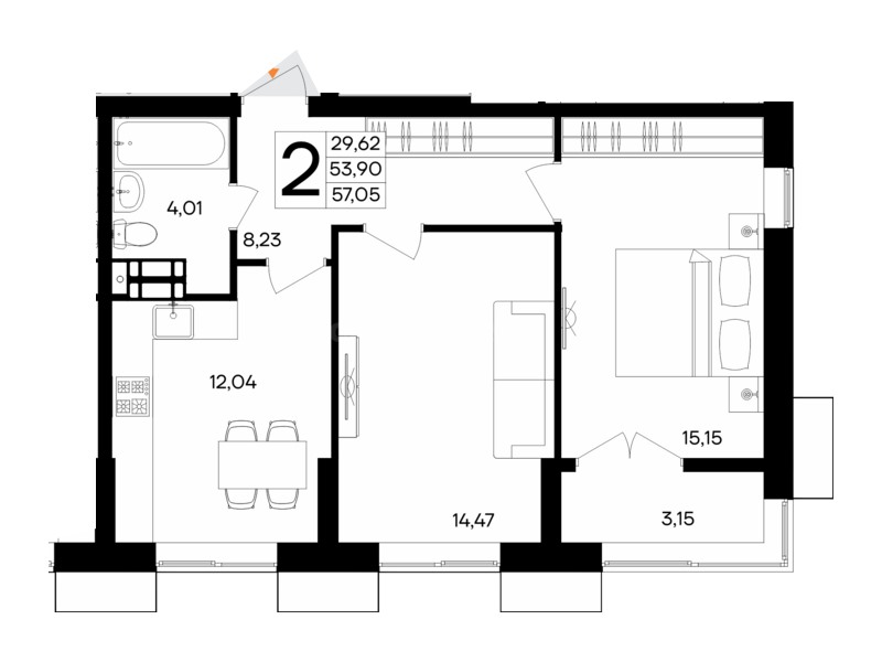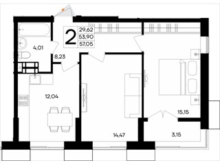 В продаже имеются квартиры в жилом комплексе "Семисчастье" премиум-класса. Общая площадь составляет 57,051 кв.м., при этом кухня - 12,04 кв.м. Высота потолков достигает 2,7 м.