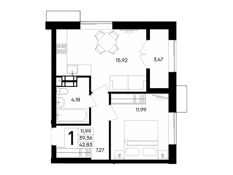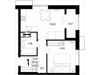 В продаже имеются квартиры в жилом комплексе "Семисчастье" премиум-класса. Общая площадь составляет 42,83 кв.м., при этом кухня - 15,92 кв.м. Высота потолков достигает 2,7 м.