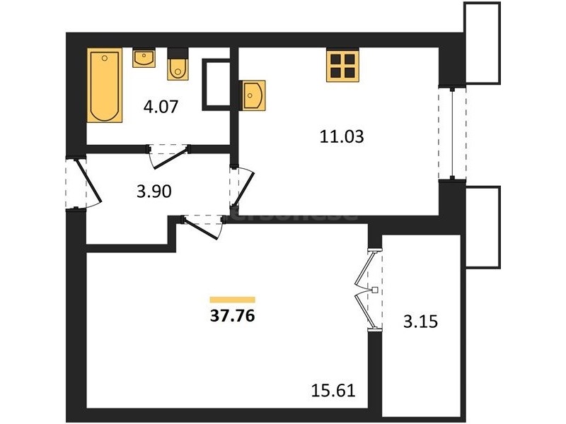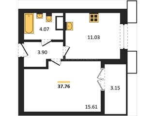 В продаже имеются квартиры в жилом комплексе "Семисчастье" премиум-класса. Общая площадь составляет 37,765 кв.м., при этом кухня - 11,03 кв.м. Высота потолков достигает 2,7 м.