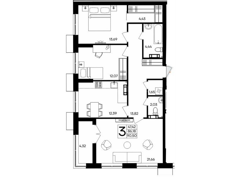 В продаже имеются квартиры в жилом комплексе "Семисчастье" премиум-класса. Общая площадь составляет 90,502 кв.м., при этом кухня - 13,5 кв.м. Высота потолков достигает 2,7 м.