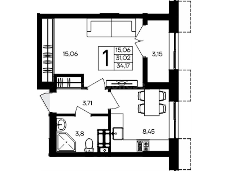 В продаже имеются квартиры в жилом комплексе "Семисчастье" премиум-класса. Общая площадь составляет 34,172 кв.м., при этом кухня - 8,45 кв.м. Высота потолков достигает 2,7 м.