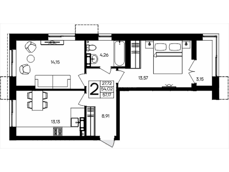 В продаже имеются квартиры в жилом комплексе "Семисчастье" премиум-класса. Общая площадь составляет 57,172 кв.м., при этом кухня - 13,13 кв.м. Высота потолков достигает 2,7 м.
