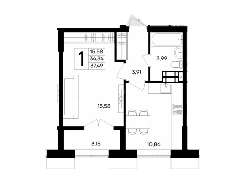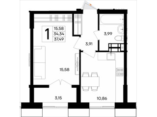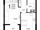 В продаже имеются квартиры в жилом комплексе "Семисчастье" премиум-класса. Общая площадь составляет 37,493 кв.м., при этом кухня - 10,86 кв.м. Высота потолков достигает 2,7 м.