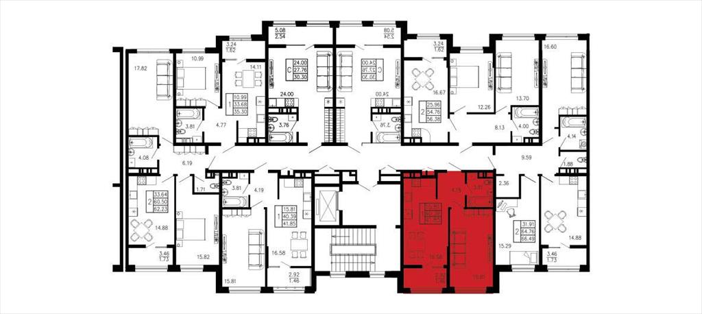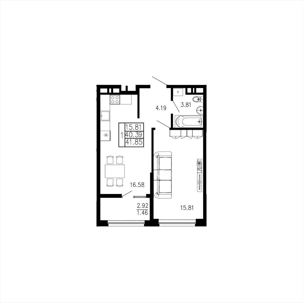 общая 41,85 м2, жилая 15,81 м2, кухни 16,58 м2 |