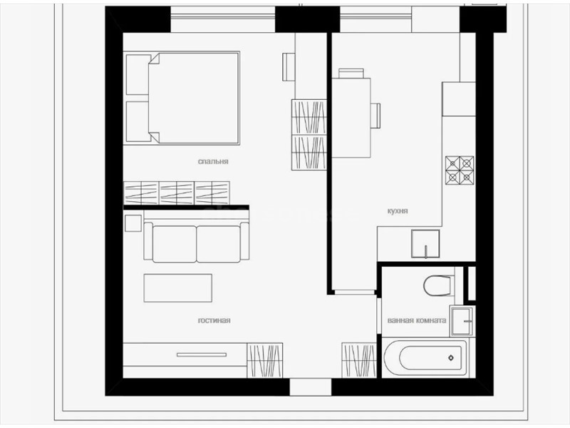 Изолированная комната обеспечивает приватность и удобство размещения спального места, рабочей зоны и зоны отдыха. Кухня отделена и имеет достаточно пространства для полноценной обеденной зоны. Коммуникации и планировка учитывают потребности современного города: практичное использование пространства, разумная зона хранения и возможность обновления интерьера под стиль владельца.