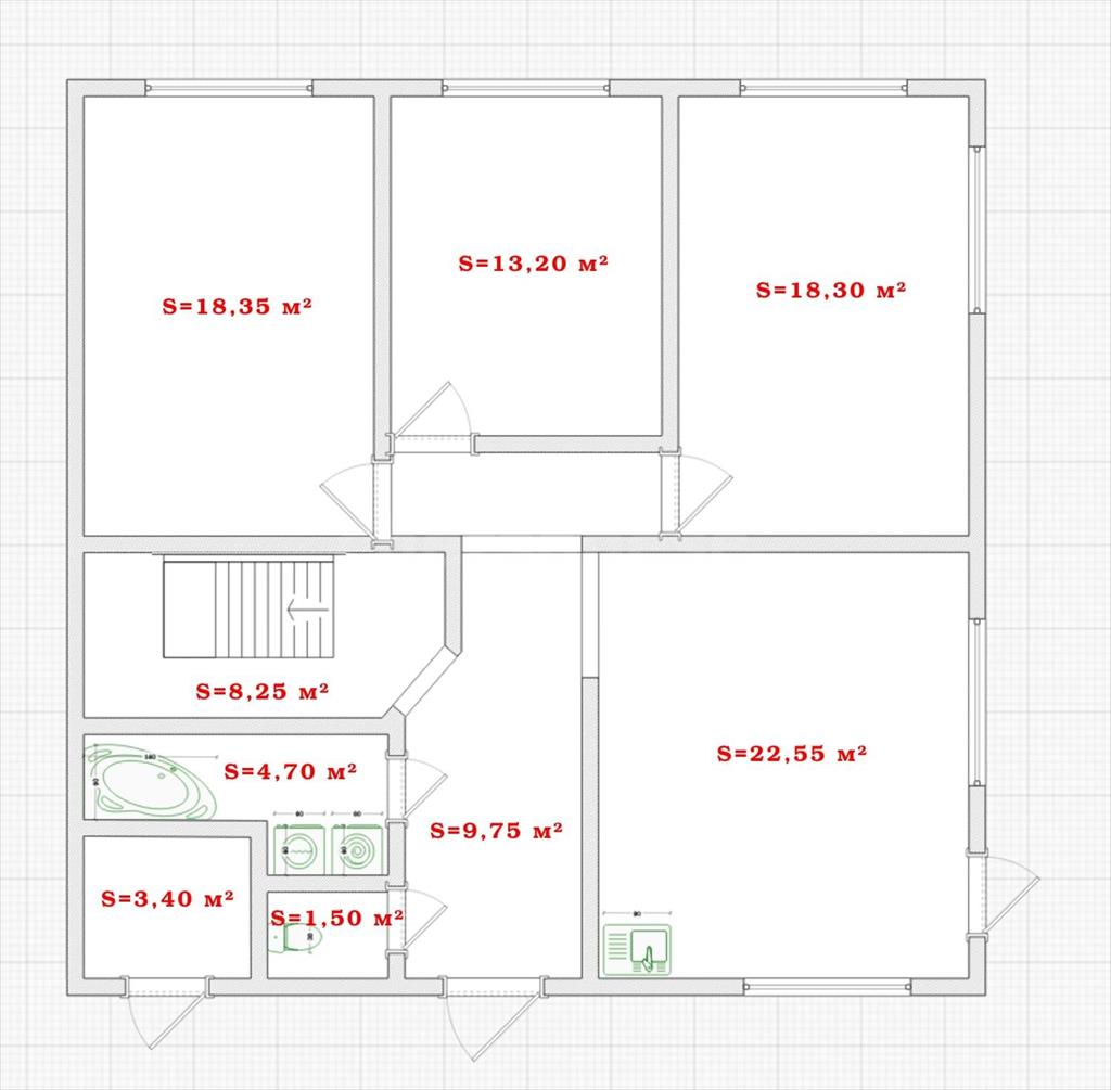 1-ый этаж - 100 кв.м. Он состоит из трёх комнат (13,5+18+18), кухни-гостиной (22,5 кв.м), туалета (2 кв.м), ванной (5 кв.м), котельной (3 кв.м), коридора (9,5 кв.м), помещения под лестницу (8,5 кв.м).