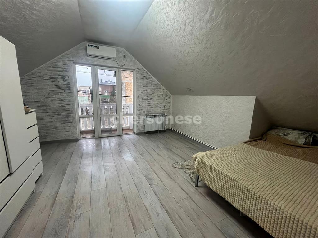 На втором этаже - две отдельные спальни, окна и балкон одной комнаты выходят во фруктовый сад, у второй комнаты балкон на противоположную сторону дома - на улицу.