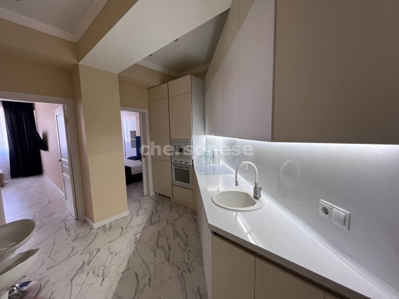 Квартира расположена на 12 этаже 16‑этажного монолитного дома нового типа. В подъезде пассажирский, и грузовой лифт, чистые аккуратные зоны. Центральное отопление, теплые полы, во дворе открытая парковка. Район с развитой инфраструктурой: рядом магазины, остановки транспорта, море, прогулочные зоны